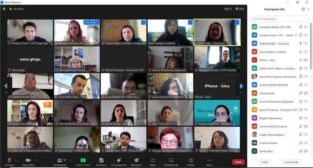 La evenimentul online au participat 59 de persoane, managerii de proiect, membrii proiectelor din cele 4 universități partenere, studenți, masteranzi doctoranzi și cercetători științifici din grupul țintă.