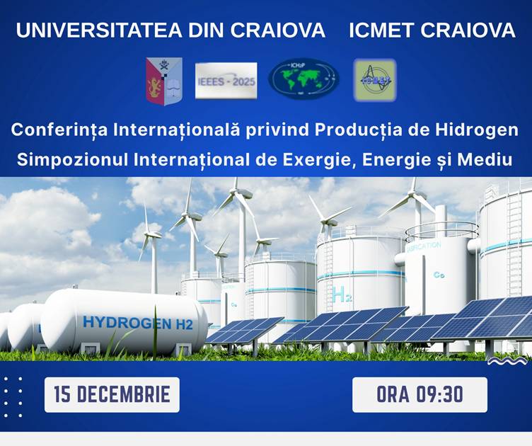 În perioada 14-18 decembrie 2025,  Universitatea din Craiova și lCMET Craiova organizează două evenimente științifice:  Conferința Internațională privind Producția de Hidrogen – ICH2P 2025 și Simpozionul Internațional de Exergie, Energie și Mediu – IEEES 2025. Deschiderea oficială va avea loc la data 15 decembrie, la ora 09:30, în Aula „Mihai I al României” (sediul central, str. A. I. Cuza, nr. 13).