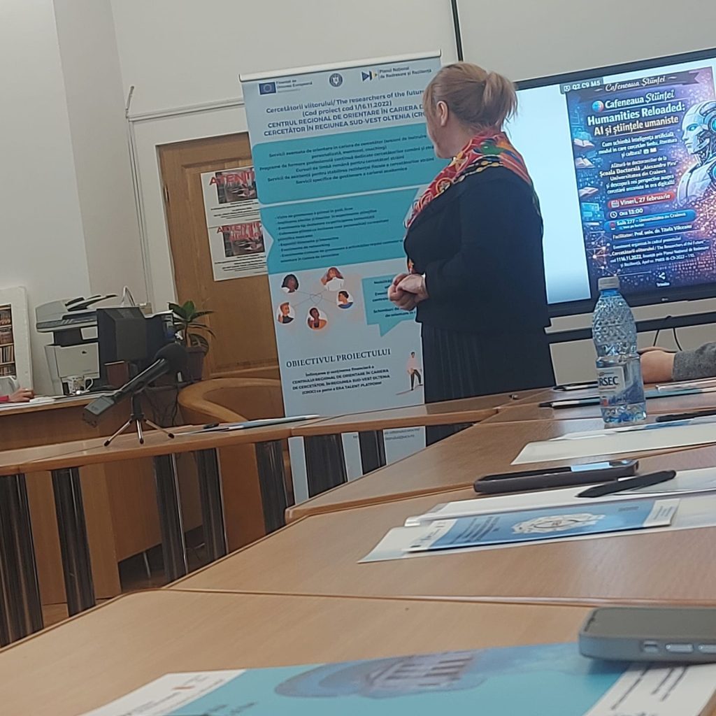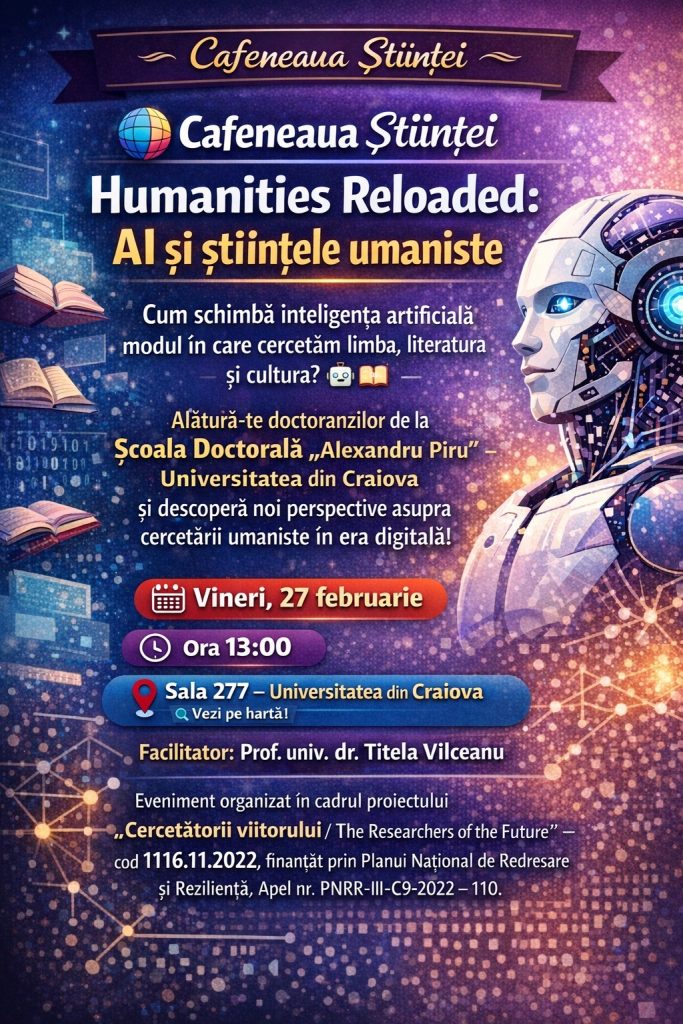 Evenimentul a făcut  parte din seria Cafeneaua Științei și reunește doctoranzi de la Școala Doctorală „Alexandru Piru” – Universitatea din Craiova, facilitator: Prof. univ. dr. Titela Vîlceanu, director al școlii doctorale.Discuțiile s-au concentrat pe impactul AI asupra cercetării în științele umaniste și au analizat modul în care tehnologiile digitale pot redefini rolul cercetătorului contemporan.